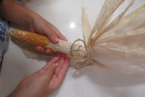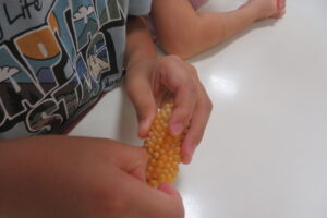 そして、今回はとうもろこし(ポップコーンです)自分たちの背よりも高く育つトウモロコシを興味深く見ていましいた。そして、収穫したトウモロコシを乾燥させトウモロコシの実をみんなで収穫しました。トウモロコシの実はとても硬く「食べれない」という声も聞こえてきました。29名の子どもたちが機械をジーっと見守る中、トウモロコシは見事にポップコーンに弾け変わりました。