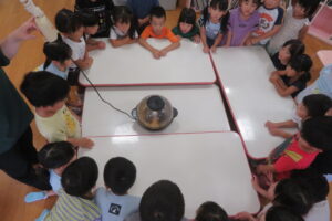 おやつの時間にわかばこども園の畑で収穫したトウモロコシをポップコーンにしていただきました。